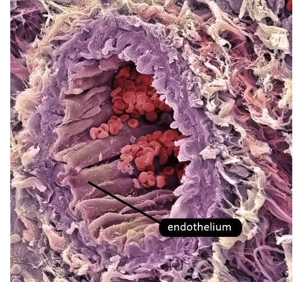 Endothelium is a single-layered sheet of flat cells of mesenchymal origin lining the inner surface of blood and lymphatic vessels, and the chambers of the heart. Endothelial cells perform many functions of the vascular system, such as: vasoconstriction and vasodilation, control of blood pressure; regulation of blood clotting components, namely thrombin and fibrin; angiogenesis (formation of new blood vessels).