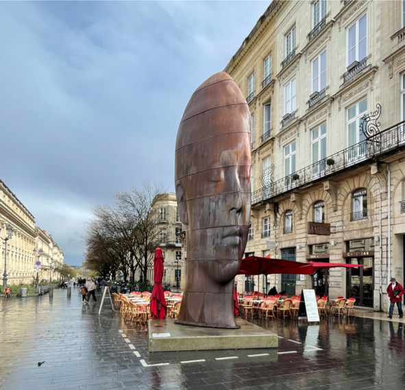 Дальше просто бредем по городу. Около театра увидели скульптуру Плензы – очередную голову. Я про него писал в Антибе. Там стоит его голова из букв, которая стала одним из символов Антиба. В Бордо скульптура Плензы будет гостить недолго Пересекаем трамвайные пути. Я поднимаю голову и не вижу проводов. Вместо них на земле токонесущий рельс. Я наступаю на него, остаюсь живым. Потом читаю, что ток там появляется только в момент прохождения трамвая. Это будущее для всех городов.
