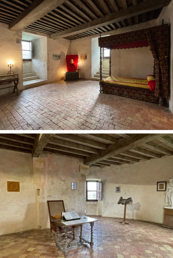 В самой башне несколько этажей. Внизу часовня, на других этажах спальня, библиотека, кабинет, вспомогательные комнаты. Отопление каминное – не представляю, как можно отопить огромную каменную башню. Комнаты сейчас практически пустые, фрески на стенах еле различимы. Его кабинет крошечный. Вот тут в течение многих лет он и работал. Сначала Монтень писал сам, потом диктовал дочери. Мучился от почечных колик, подагры и несварения желудка. Но держался стойко, жалобы на здоровье в его эссе почти не встречаются. Из окон башни можно посмотреть на сам замок. Красоты он неописуемой, но это результат поздней перестройки.