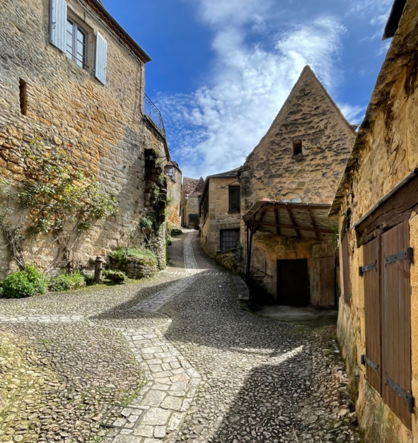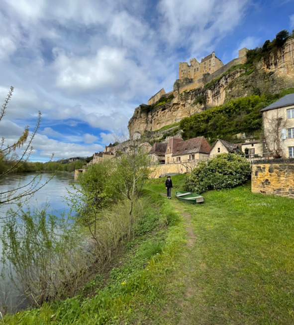 Под скалой, на берегу реки находится городок Казнак. Некоторые улицы идут почти вертикально вверх – каждая из них упражнение для укрепления организма. Ведут эти улицы в городок Бейнак, к одноименному замку. Вдоль реки прогулочная тропа, на которой стоят панели с копиями картин побывавших тут художников. На самой реке байдарки, над рекой голубое с облаками небо. Тут хотелось сидеть и любоваться красотами, но со скалы на нас укоризненно смотрел исторический замок двенадцатого века. К нему мы и направились.