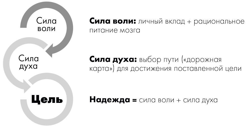 Наша конечная цель – помочь вам зарядиться энергией и обрести ясность ума, а также надежду на лучшее будущее. Более 10 лет назад доктор Чен Хеллман решил узнать, как надежда влияет на людей, оказавшихся в безвыходной, на первый взгляд, ситуации. Он обнаружил, что те, кто сохраняет надежду, гораздо лучше справляются с трудностями. В 2019 г. Хеллман совместно со своей коллегой Кейси Гвинн написал книгу «Свет надежды» (Hope Rising), в которой надежда определяется как «вера в то, что лучшая жизнь возможна и вы способны сделать ее такой». Хеллман и Гвинн опираются на исследование Рика Снайдера, выделившего два компонента надежды: 1) сила воли – вдохновение и мотивация в сочетании с достаточным количеством энергии, необходимой для достижения поставленной цели; 2) сила духа – целеустремленность и уверенность в том, что вы выбрали правильный путь и способны справиться с трудностями и эмоциями, которые с ними связаны.