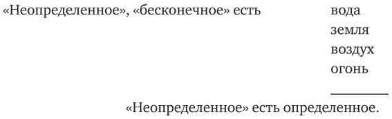 Но в этой форме выражается совсем не то содержание, которое хотел выразить Анаксимандр. Действительное содержание понятия первоначала не может быть выражено только в форме противопоставления неопределенного определенному, ведь первоначало содержится и в воде, и в воздухе, и в земле, и в огне, то есть во всем определенном. Поэтому вслед за первым суждением возникает второе, противоречащее ему.