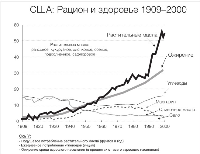 Эта диаграмма показывает всю историю. Чем больше растительных масел мы употребляем, тем толще становимся. С 1909 года потребление сливочного масла, сала, маргарина или углеводов увеличилось незначительно. Потребление глютена тоже изменилось несущественно, о чем свидетельствует относительно ровный график потребления углеводов. Но на протяжении столетия чем больше мы ели растительного масла, тем более толстыми и больными становились.