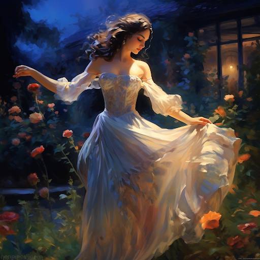 Обойдя весь сад, девушка медленно возвращалась к замку, как вдруг услышала чарующую музыку. «Танцы! Бал начался!» Она хотела вернуться в замок, но обнаружила, что его двери закрыты. В светящихся окнах мелькали силуэты танцующих, слышался смех и весёлый гомон, а музыка не переставала звучать ни на мгновенье. «Раз я не могу зайти в замок, буду танцевать здесь!» – решила она и, подхватив рукой мешающее платье, закружилась между цветущих клумб, чувствуя себя не менее счастливой, чем если бы она была сейчас там, среди танцующих.