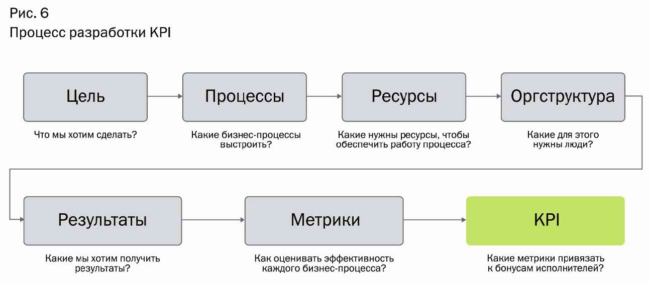 Если посмотреть на место KPI в цепочке управления (см. рис. 6), то сначала у руководителя появляется цель. Например, вы решили запустить доставку. Теперь нужно придумать, какие процессы необходимо выстроить, например, проработать блюда, сформировать ценообразование и бюджет, проработать айдентику, произвести упаковку, обучить персонал, выстроить маркетинг и многие другие. Затем вам будет необходимо продумать, какие ресурсы под это понадобятся: материальные и нематериальные. Далее вам нужны люди, чтобы процессы функционировали. Потом на основании предыдущих шагов вы будете просчитывать с командой, какие хотите получить результаты. И затем, по каким метрикам необходимо оценивать эффективность и какой плановый KPI необходимо установить и привязать к бонусам исполнителей.