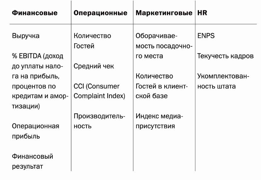 Если коротко систематизировать метрики, то мы выделяем пять основных групп: финансовые, операционные, маркетинговые и метрики, связанные с управлением персоналом и масштабированием. У нас сформулированы десятки метрик по разным бизнес-процессам, и по ним мы планируем целевые показатели для сотрудников, но ключевых KPI, которые привязываем к бонусам, обычно выбираем не более четырех. Ниже привожу пример KPI для управляющих ресторанами по четырем группам: