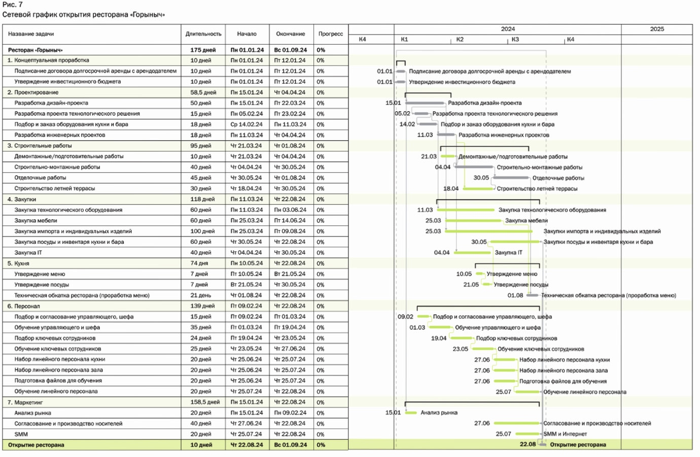 На сегодня существует много онлайн-программ и приложений для ведения сетевого графика. Мы пользуемся программой Microsoft Project. Как это работает? Вначале вы тратите много времени на описание всех операций бизнес-процесса с указанием продолжительности и владельцев каждой из них. Затем фиксируете взаимосвязи между ними в программе (начало какой операции от какой зависит). В дальнейшей работе благодаря этому вы сможете видеть, насколько сдвигаются сроки старта других операций и всего бизнес-процесса в целом. Вы четко определите дату открытия и сэкономите много ресурсов. Это позволит вам правильно формировать график инвестирования и точно знать, когда необходимо выводить операционную команду.