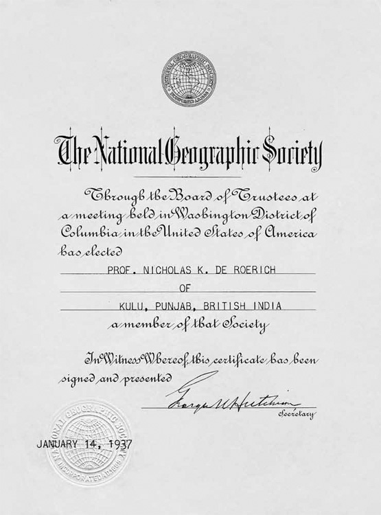 Диплом члена Американского национального географического общества, выданный Н.К.Рериху