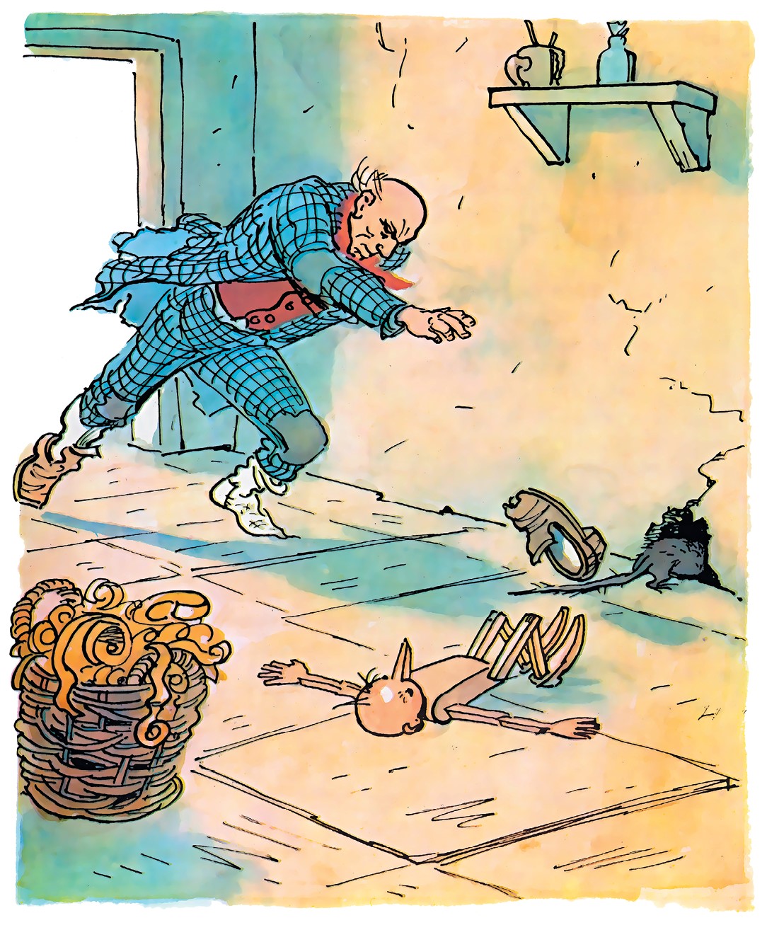 Карло сделал ему из лучинок длинные ноги с большими ступнями. На этом окончив работу, поставил деревянного мальчишку на пол, чтобы научить ходить.