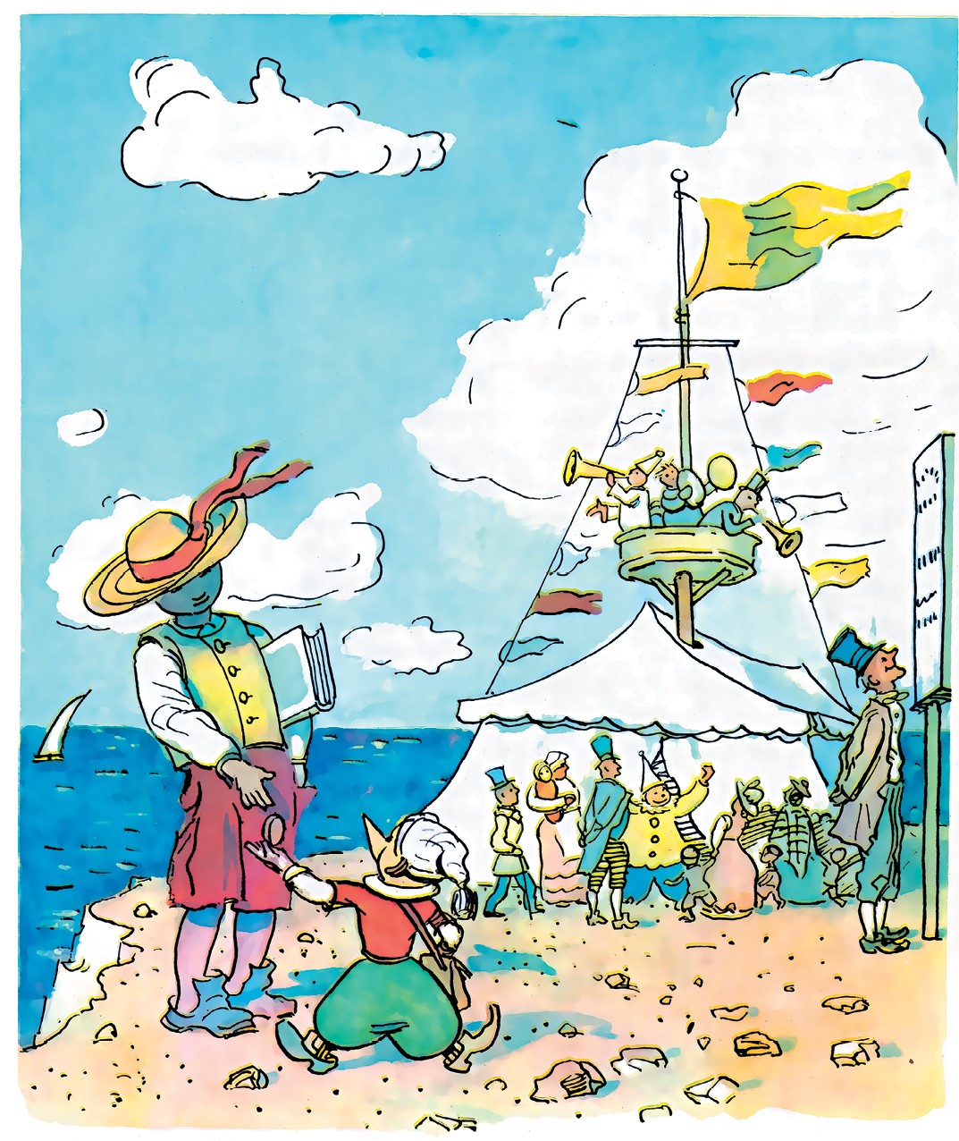 Что есть духу он пустился бежать к морю. Он увидел полотняный балаган, украшенный разноцветными флагами, хлопающими от морского ветра. На верху балагана, приплясывая, играли четыре музыканта. Внизу полная улыбающаяся тётя продавала билеты. Около входа стояла большая толпа – мальчики и девочки, солдаты, продавцы лимонада, кормилицы с младенцами, пожарные, почтальоны, – все, все читали большую афишу: