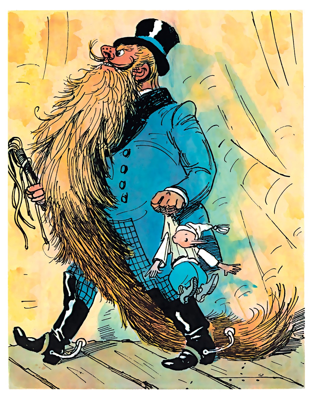 Увидев бегущего деревянного человечка, он широко расставил ноги, загородив ими всю улицу. Буратино хотел проскочить у него между ног, но полицейский схватил его за нос и так держал, покуда не подоспел папа Карло.
