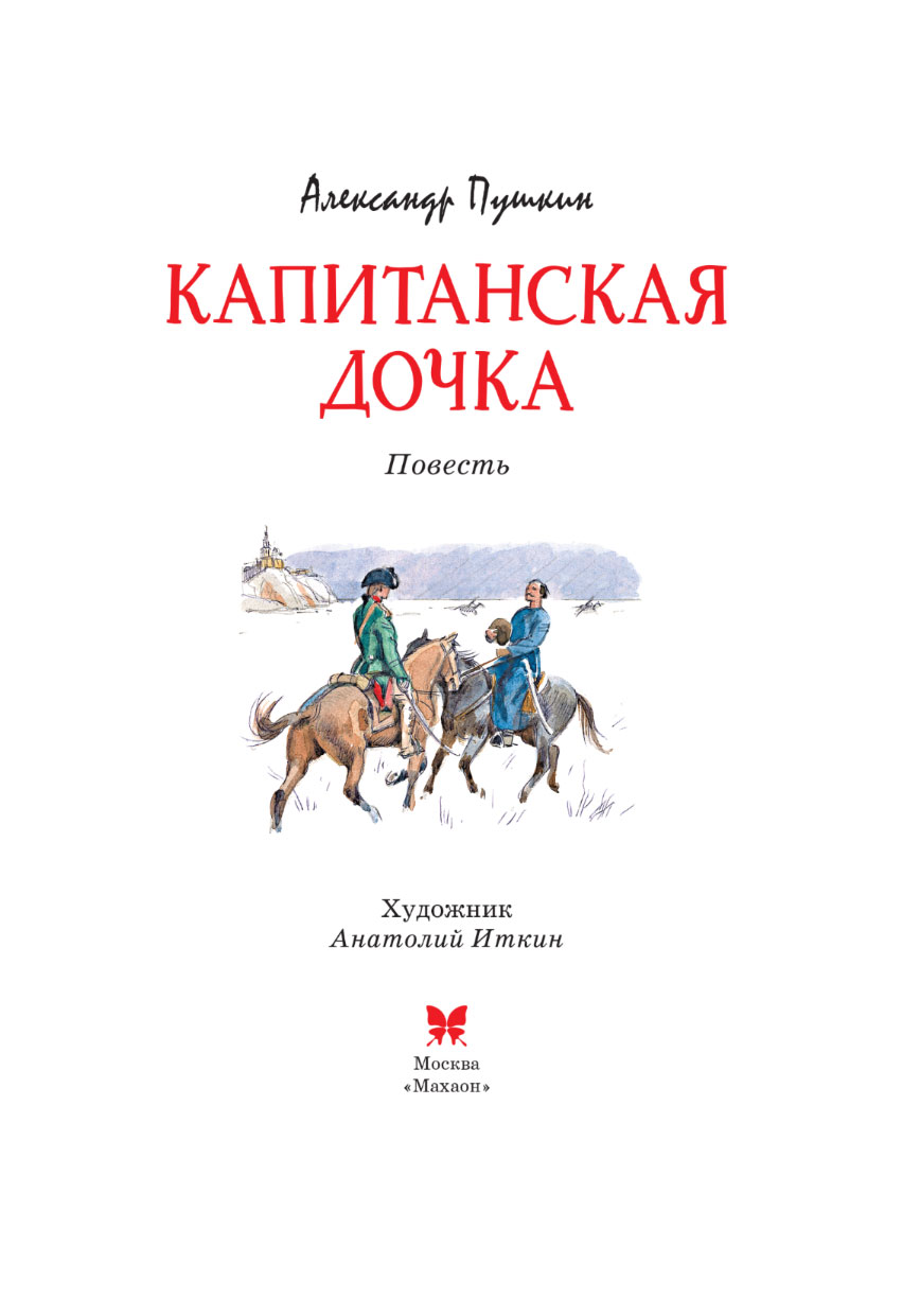 Княжнин[1]О тец мой, Андрей Петрович Гринёв, в молодости своей служил при графе Минихе[2] и вышел в отставку премьер-майором в 17… году. С тех пор жил он в своей симбирской деревне, где и женился на девице Авдотье Васильевне Ю., дочери бедного тамошнего дворянина. Нас было девять человек детей. Все мои братья и сёстры умерли во младенчестве. Матушка была ещё мною брюхата, как уже я был записан в Семёновский полк сержантом, по милости майора гвардии князя Б., близкого нашего родственника. Если бы, паче всякого чаяния, матушка родила дочь, то батюшка объявил бы куда следовало о смерти неявившегося сержанта, и дело тем бы и кончилось. Я считался в отпуску до окончания наук[3]. В то время воспитывались мы не по-нонешнему. С пятилетнего возраста отдан я был на руки стремянному[4] Савельичу, за трезвое поведение пожалованному мне в дядьки[5]. Под его надзором на двенадцатом году выучился я русской грамоте и мог очень здраво судить о свойствах борзого кобеля. В то время батюшка нанял для меня француза, мосье Бопре, которого выписали из Москвы вместе с годовым запасом вина и прованского масла. Приезд его сильно не понравился Савельичу. «Слава богу, – ворчал он про себя, – кажется, дитя умыт, причёсан, накормлен. Куда как нужно тратить лишние деньги и нанимать мусье, как будто и своих людей не стало!»