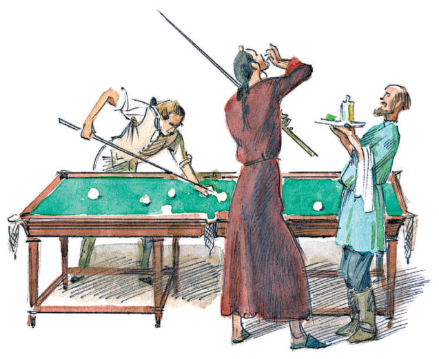 В ту же ночь приехал я в Симбирск, где должен был пробыть сутки для закупки нужных вещей, что и было поручено Савельичу. Я остановился в трактире. Савельич с утра отправился по лавкам. Соскуча глядеть из окна на грязный переулок, я пошёл бродить по всем комнатам. Вошед в биллиардную, увидел я высокого барина лет тридцати пяти, с длинными чёрными усами, в халате, с киём в руке и с трубкой в зубах. Он играл с маркёром[11], который при выигрыше выпивал рюмку водки, а при проигрыше должен был лезть под биллиард на четвереньках. Я стал смотреть на их игру. Чем долее она продолжалась, тем прогулки на четвереньках становились чаще, пока наконец маркёр остался под биллиардом. Барин произнёс над ним несколько сильных выражений в виде надгробного слова и предложил мне сыграть партию. Я отказался по неумению. Это показалось ему, по-видимому, странно. Он поглядел на меня как бы с сожалением; однако мы разговорились. Я узнал, что его зовут Иваном Ивановичем Зуриным, что он ротмистр гусарского полку[12] и находится в Симбирске при приёме рекрут, а стоит в трактире. Зурин пригласил меня отобедать с ним вместе чем бог послал, по-солдатски. Я с охотою согласился. Мы сели за стол. Зурин пил много и потчевал и меня, говоря, что надобно привыкать ко службе; он рассказывал мне армейские анекдоты, от которых я со смеху чуть не валялся, и мы встали из-за стола совершенными приятелями. Тут вызвался он выучить меня играть на биллиарде. «Это, – говорит он, – необходимо для нашего брата служивого. В походе, например, придёшь в местечко – чем прикажешь заняться? Ведь не всё же бить жидов. Поневоле пойдёшь в трактир и станешь играть на биллиарде; а для того надобно уметь играть!» Я совершенно был убеждён и с большим прилежанием принялся за учение. Зурин громко ободрял меня, дивился моим быстрым успехам и, после нескольких уроков, предложил мне играть в деньги, по одному грошу, не для выигрыша, а так, чтоб только не играть даром, что, по его словам, самая скверная привычка. Я согласился и на то, а Зурин велел подать пуншу и уговорил меня попробовать, повторяя, что к службе надобно мне привыкать; а без пуншу что и служба! Я послушался его. Между тем игра наша продолжалась. Чем чаще прихлёбывал я от моего стакана, тем становился отважнее. Шары поминутно летали у меня через борт; я горячился, бранил маркёра, который считал бог ведает как, час от часу умножал игру, словом – вёл себя, как мальчишка, вырвавшийся на волю. Между тем время прошло незаметно. Зурин взглянул на часы, положил кий и объявил мне, что я проиграл сто рублей. Это меня немножко смутило. Деньги мои были у Савельича. Я стал извиняться. Зурин меня прервал: «Помилуй! Не изволь и беспокоиться. Я могу и подождать, а покамест поедем к Аринушке».