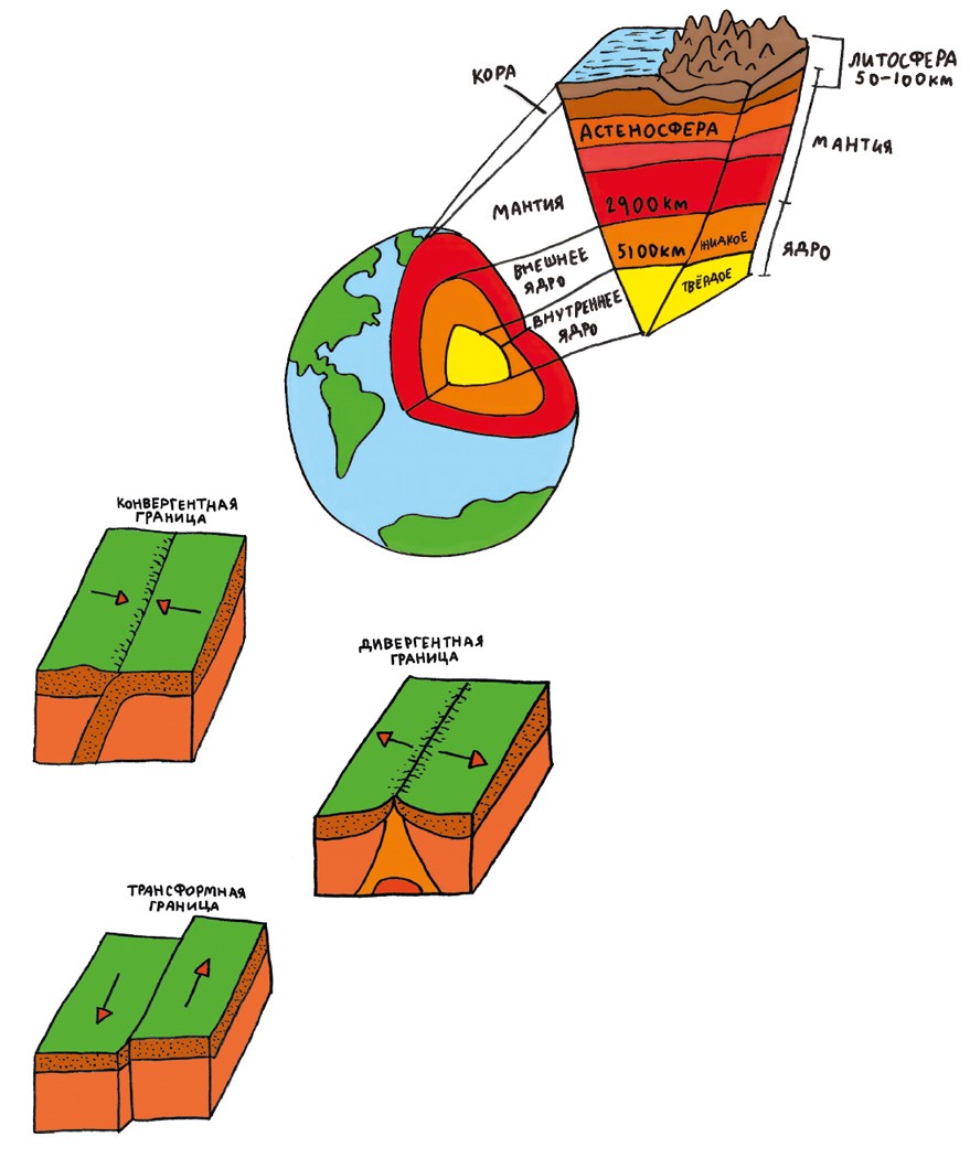 Внешний слой Земли (литосфера) состоит из огромных твердых плит под названием «тектонические плиты», которые плавают поверх толстого слоя расплавленной породы – магмы. Земля под ногами кажется нам прочной и непоколебимой. А о надежном и прагматичном человеке мы говорим, что он «прочно стоит на земле». На самом же деле тектонические плиты постоянно движутся, подстраиваясь под течения магмы под ними.