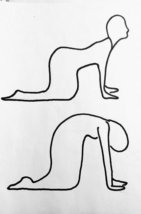 – упражнение в динамике кошка-корова, классическое упражнение всем известное, стоя на корточках делайте прогибы позвоночника по всей длине вместе с головой вверх и вниз в течении 1 минуты.