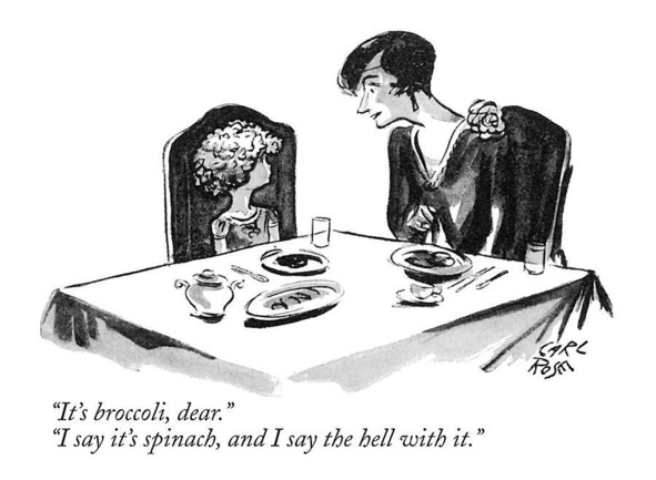 Широко известна карикатура, где мать пытается убедить дочь, что брокколи на тарелке – это шпинат. Ребенок, не соглашаясь, произносит фразу «Я говорю, что это шпинат», что стало классическим примером в американской культуре. Эта фраза «I say it’s spinach» («Я говорю, что это шпинат») как синоним слова «чушь» впервые появилась в журнале The New Yorker в 1928 году.