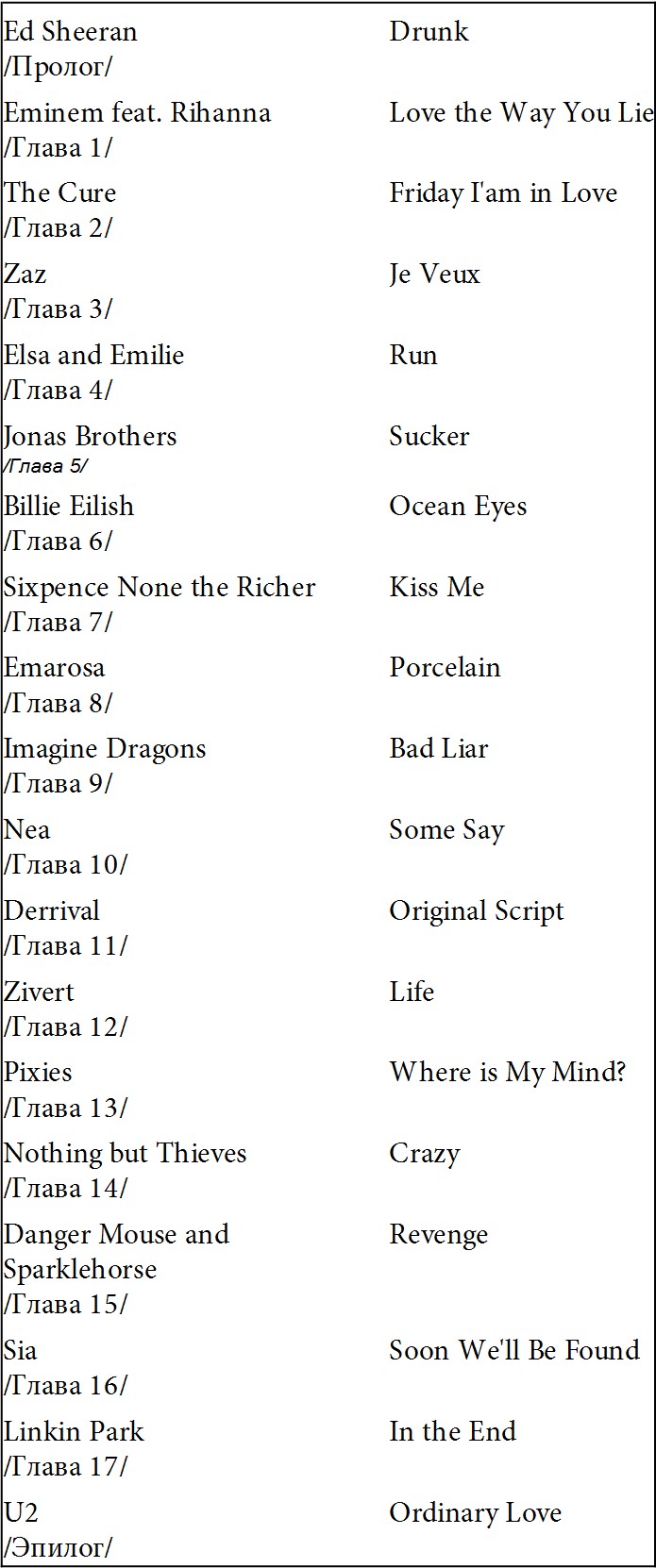 Каждой главе соответствует определённая музыкальная композиция. Автор рекомендует читать под музыку. Плейлист можно найти в начале книги.