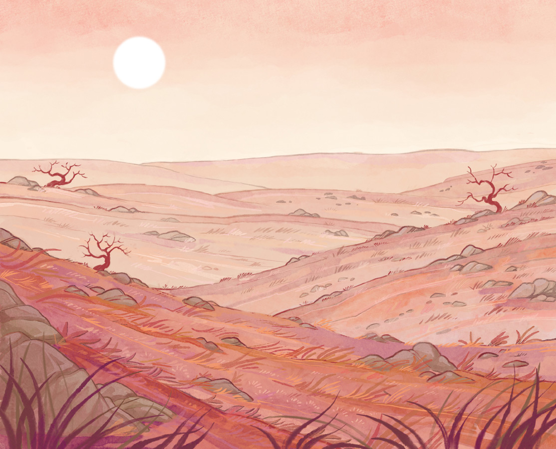 Они шли по пустоши несколько дней. Изредка им попадалась какая-то растительность, но чем дальше на запад они пробирались, тем меньше живого оставалось в этих выжженных давней войной землях.