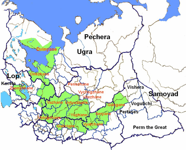So «Stepennaya book» in the «13th degree» calls: «These are the names of foreign-language countries and places living near Perm: Dvinyane, Ustyuzhane, Vilezhane, Vychegzhane, Penezhane, Yuzhane, Seriane, Gangane, Vyatchane, Lop, Korela, Yugra, Pechera, Vogulichi, Samoyad, Pertasy, Great Perm, Gamal, Chyusovaya.»