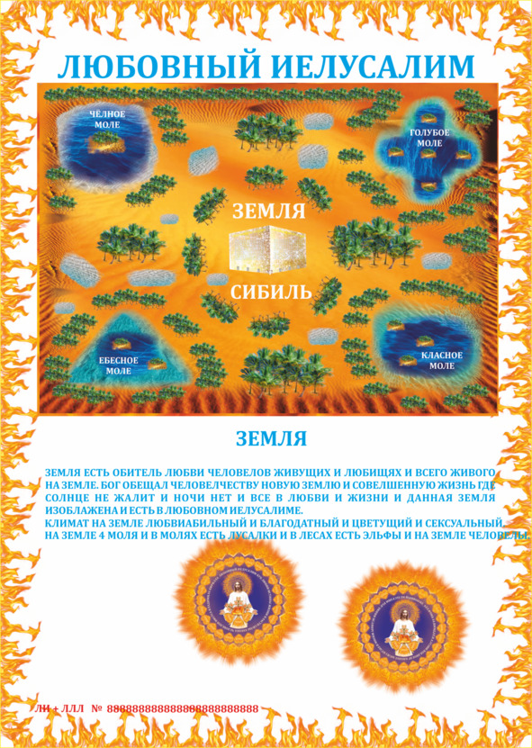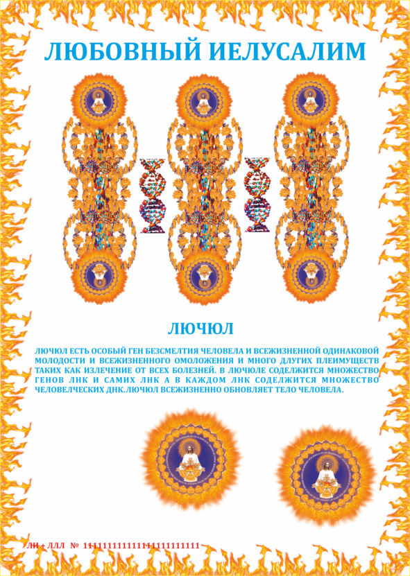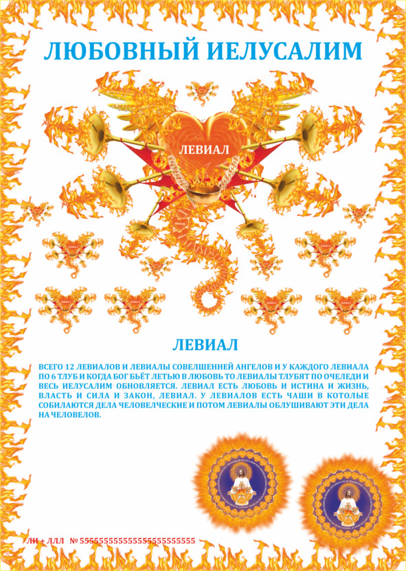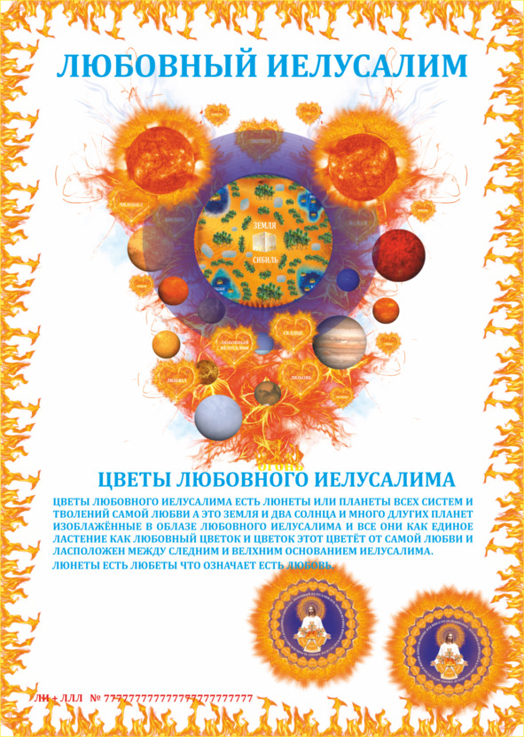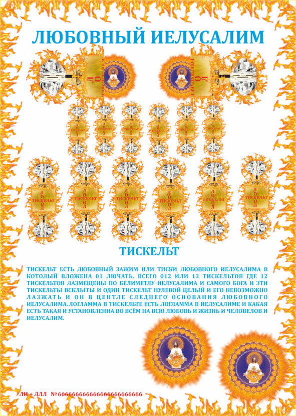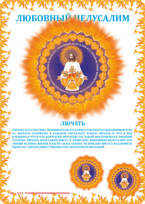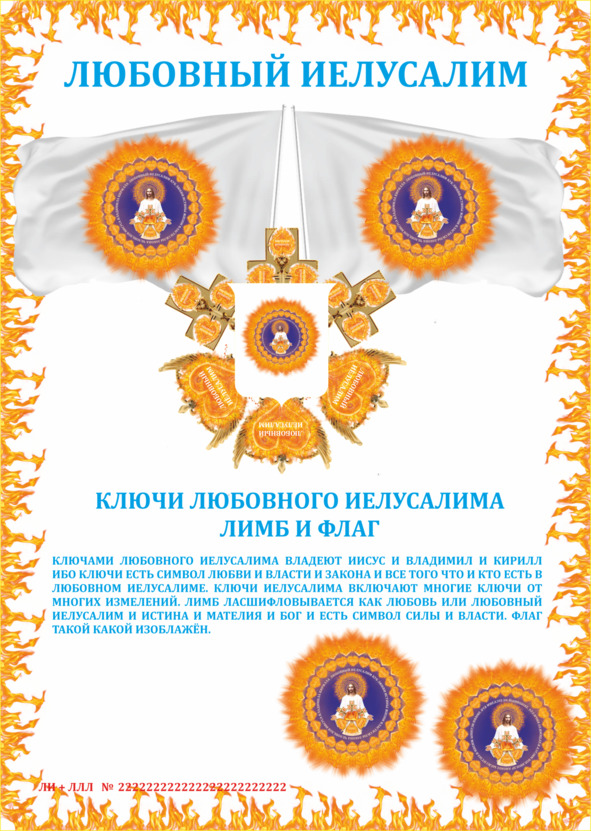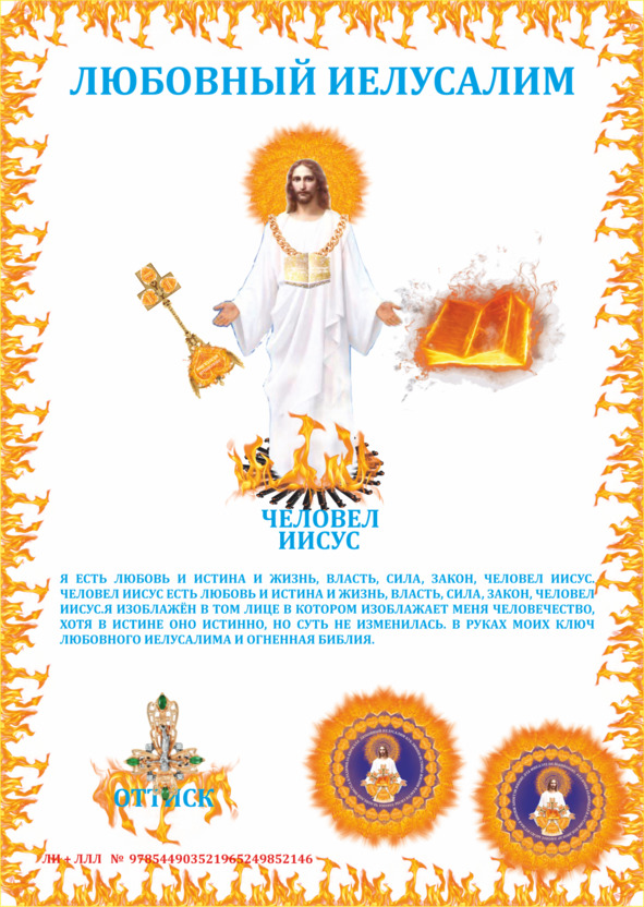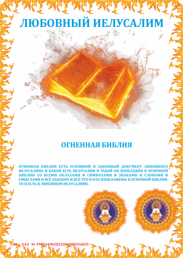И вот Иисус делжит в луках огненную библию и читает и судит и огненная библия есть законный документ любовного Иелусалима и включает и состоит из 8 глав и они же есть 8 книг опечатанная 2 лючатями любовного Иелусалима и никому не дано снять эти лючати: