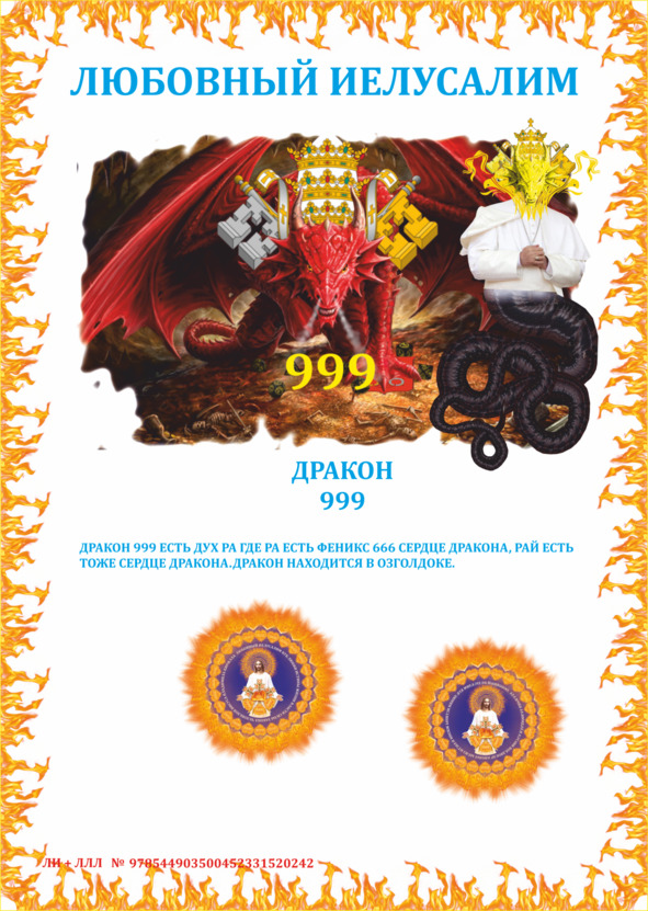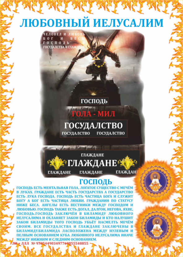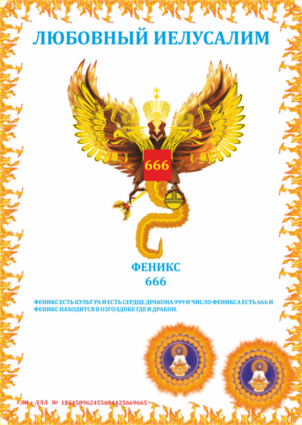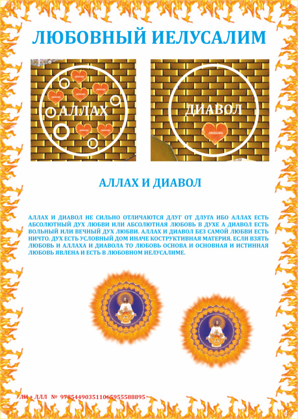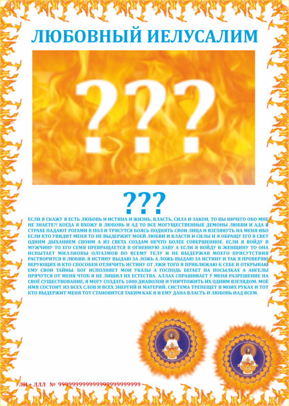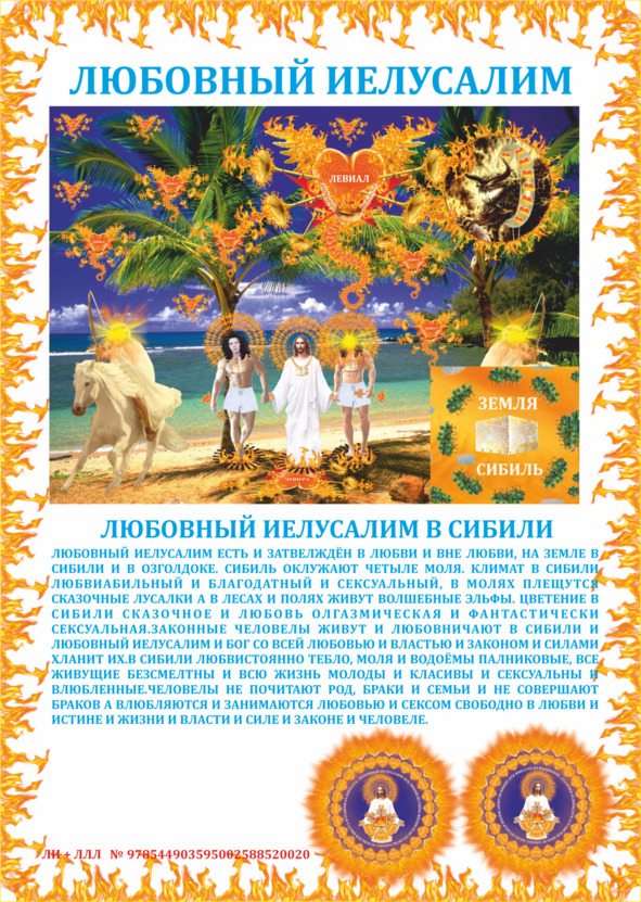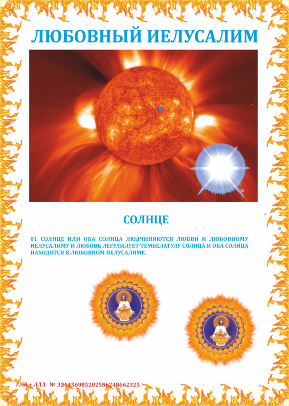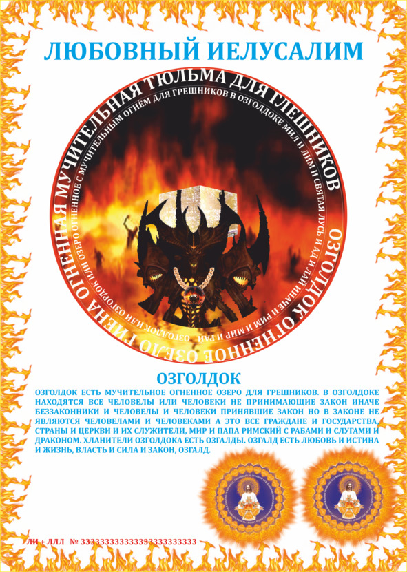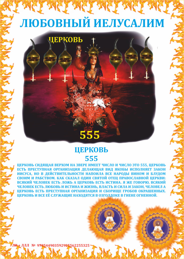 И вот Иисус делжит в луках огненную библию и читает и судит и огненная библия есть законный документ любовного Иелусалима и включает и состоит из 8 глав и они же есть 8 книг опечатанная 2 лючатями любовного Иелусалима и никому не дано снять эти лючати: