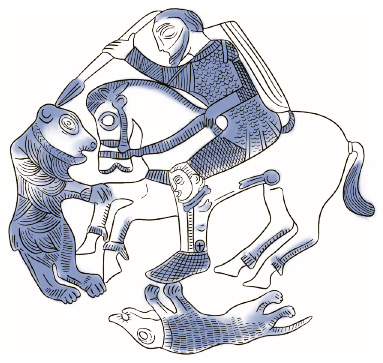 Герон убивает медведя, а у ног его коня – убитый волк. На наколеннике всадника изображен лик Бендиды, что свидетельствует о ее покровительстве. Изображение на детали конской сбруи. IV в. до н. э.