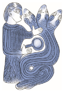 Царь-жрец с зеркалом и трехголовый дракон хаоса. Изображение на детали конской сбруи. IV век до н. э.
