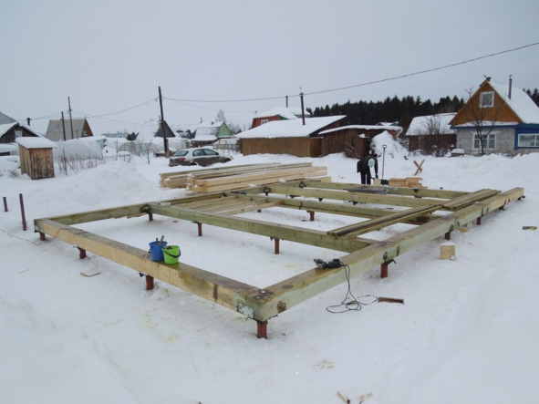Конечно, довольно много сил и времени уходило именно на перенос бруса и его антисептирование. Кроме того, чистка снега и на стройплощадке и подъезда также отнимала время. Ещё такой момент. Даже когда холодно, но солнечно, снег может таять на солнце и образовывать на дереве тонкую наледь. Эту наледь с досок надо было также счищать. А вот уже и февраль. А мы только сделали ростверк. Нулевой цикл.