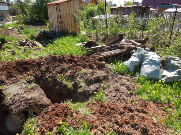 Участок был куплен в конце марта. Всё под снегом. В апреле снег сошёл и открылась неприглядная картина. Участок был очень запущен за много лет (да, лучше смотреть и покупать участки без снега). В майские праздники поехали наводить порядок. На это у нас ушло более месяца. Я не предполагал, что на столь маленьком участке может быть столько мусора. Много сожгли в яме, которая видимо когда-то была погребом. Остальное вывезли.