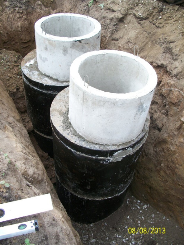 Септик. Сделал его стандартно, из бетонных колец, 1 м диаметр, двухкамерным, то есть два колодца, и на две трубы. Одна от унитаза, вторая от всего остального. Здесь был счастливый случай. Когда копали экскаватором котлован, глины, пески, суглинки, дошли до нужной глубины. Тут ковшом чуть углубились, и оказалось, что глубже был гравий с песком. Отлично! Плеснул ведро воды, тут же вода ушла. Самосвал с щебнем, который прикупил на подсыпку подушки, оказался не очень нужным. Но потребовалось докупать ещё доборные кольца из-за увеличившейся глубины котлована.