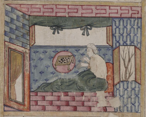 Рис. 6.2. Шахматный стол-календарь, «Внушительный замок», «Книга сюрпризов» (Китаб аль-Булхан), л. 39a