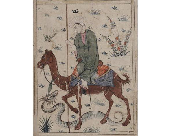 Еще одна картинка «Человек, сидящий на верблюде, убивает дракона копьем» отсылает нас к зороастрийскому мифу о борьбе со змеем Аждахаком.