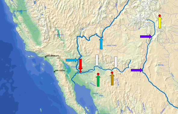 Река Колорадо (голубые стрелки), река Рио-Гранде (сиреневые стрелки), река Хила (белые стрелки), перевал Санта-Фе (желтая стрелка), Юма (красная стрелка), Марикопа-Веллс (зеленая стрелка), Тусон (коричневая стрелка)
