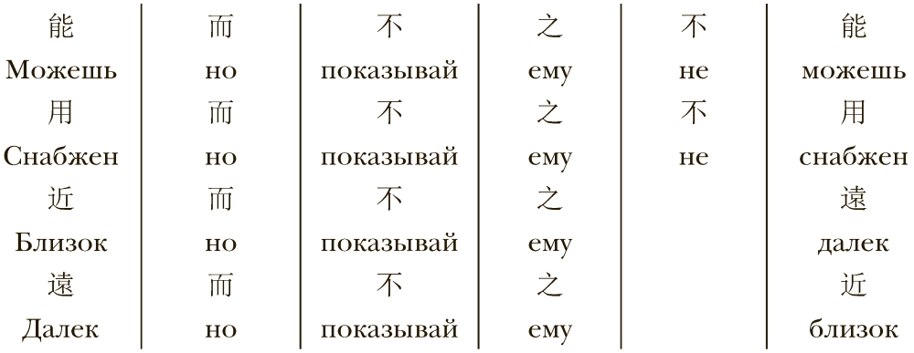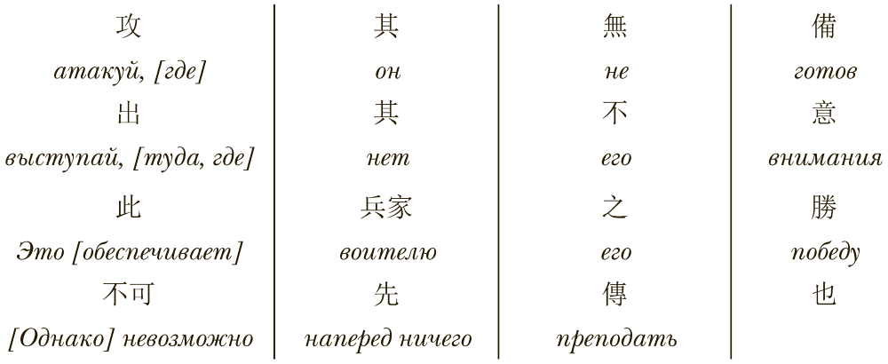 Эти особенности построения текста делают всеобщий структурный параллелизм важнейшим выразительным средством трактата[8]. Приведем пример, иллюстрирующий все приведенные особенности. Перевод дается буквальный, без дополняющих смысл частей в квадратных скобках, дабы читатель мог представить, как этот текст виден коренному жителю Китая. В качестве «препарируемого» выступит знаменитый отрывок первой главы памятника, подаривший миру любимый многими афоризм «Война – это путь обмана». Фрагмент весьма показателен, поскольку включает в себя несколько типичных для китайских философских (трактаты), полемических (споры) и официальных (чиновничьи доклады и указы) текстов формальных частей: введения темы, связующих фрагментов, раскрытия темы и резюмирующей концовки.
