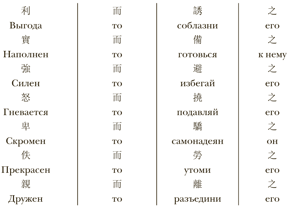 Отметим, что в данном случае иероглиф «эр» (而), выступающий в письменном языке в качестве универсального служебного слова для передачи различных союзов, переводится как «[Если] А то B». Здесь уже дается инструкция – перечень конкретных действий, необходимых для победы. Этот блок является не философским обоснованием, а практической частью.