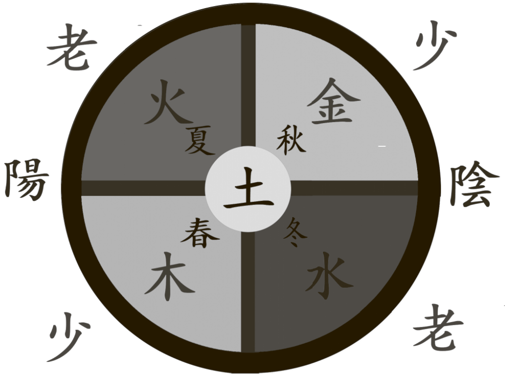 Переходы составляют две пары противоположностей Инь-Ян (陰陽). Два «плотных, явных и оформленных» состояния ци фаз «нарождения» (шао 少). «Металл» цзинь 金 и «Дерево» му 木 соответствуют осени и весне, западу и востоку. Два «легких, скрытых и амформных» состояния ци фаз «экстремумов» развития (лао 老): «Вода» шуй 水 и «Огонь» хо 火 соответствуют зиме и лету, северу и югу. Объединяет круговращение четырех переходов «кормящая» «Почва» (ту 土), так или иначе присущая всем четырем сезонам года. Она соответствует пятой традиционной китайской «стороне света» – центру. Как субстанция, принимающая и рождающая жизнь, Почва зачинает и завершает каждый цикл круговращения.
