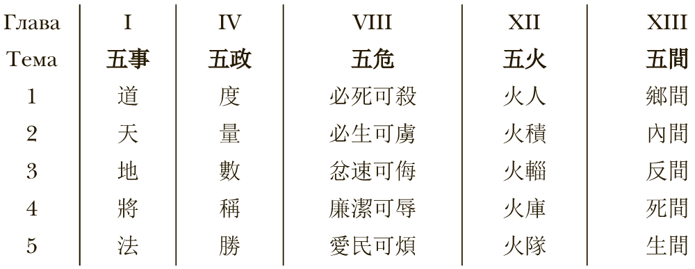 Кроме того, например, в III главе без называния классификационной категории рассказывается о пяти общих условиях для достижения победы, в VIII главе многократно встречаются классификационные схемы местности и поведения на них, также имеющие пятичленную структуру.