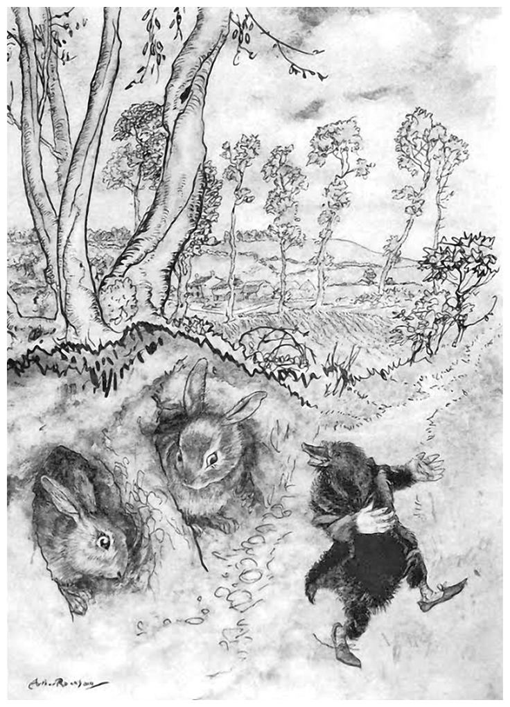 Однако мгновение спустя он в полном замешательстве уже смотрел вслед Кроту, который как ни в чем не бывало, презрительно и даже с раздражением продолжил свой путь вдоль живой изгороди, посмеиваясь над другими кроликами, поспешно высовывавшими головы из своих норок, чтобы узнать, что происходит.