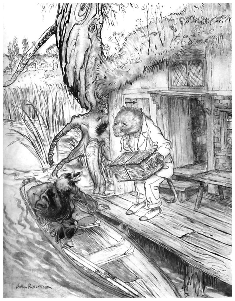 – Тогда подожди меня тут минутку! – сказал Крыс. Он привязал веревку к скобе причального столбика, вскарабкался ко входу в свой домик и спустя недолгое время вернулся, сгибаясь под тяжестью весьма объемной плетеной корзинки с едой.