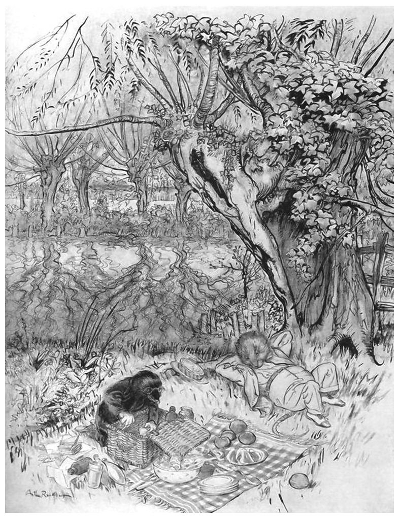 Крыс причалил, привязал лодку, помог все еще ошеломленному Кроту сойти на берег и притащил корзинку с едой. Крот попросил его в порядке одолжения позволить ему распаковать ее, и Крыс с удовольствием предоставил ему такую возможность, а сам растянулся на траве и предался праздности, пока его взволнованный друг расстилал скатерть, один за другим доставал из корзины загадочные свертки и аккуратно раскладывал их, не переставая восклицать: