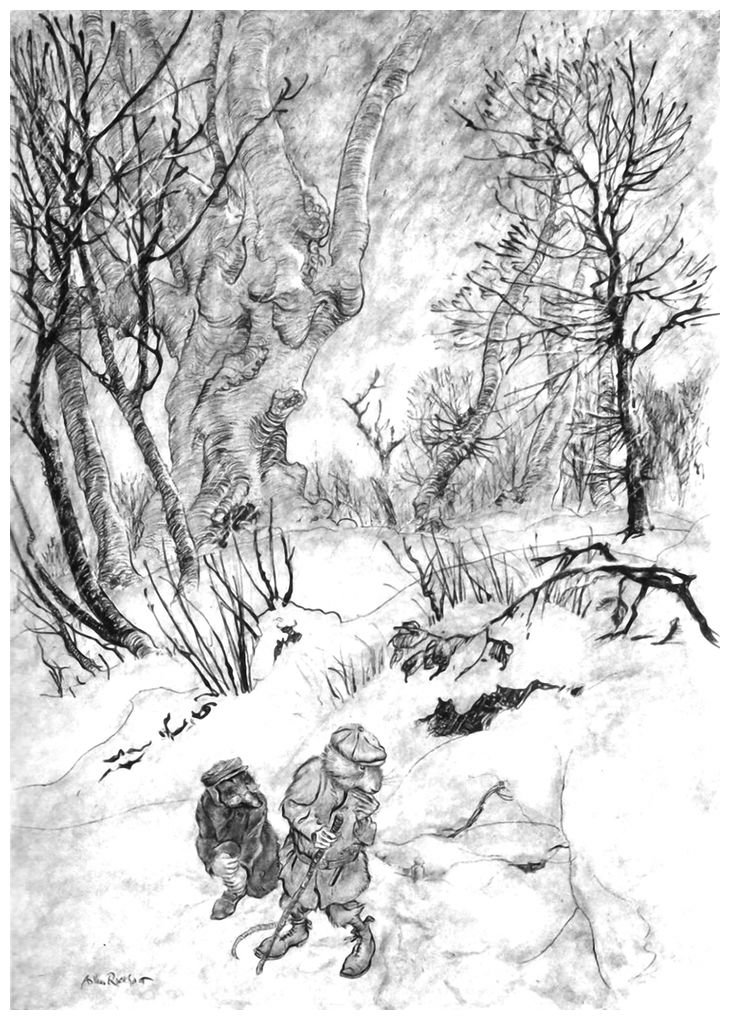 – Мы не можем здесь долго рассиживаться, – сказал Крыс. – Нужно сделать еще один рывок. Ну или хоть что-нибудь сделать. Такой холод – не шутки, а снег скоро станет таким глубоким, что мы не сможем через него идти. – Он огляделся вокруг, немного поразмыслил и продолжил: – Послушай, вот что пришло мне в голову. Видишь, вон впереди – лощина, земля там, похоже, неровная, кочковатая, бугристая. Мы пойдем туда и попробуем найти какое-нибудь укрытие – пещерку или норку с сухим полом, где можно спрятаться от снега и ветра, и, прежде чем снова пуститься в путь, хорошенько отдохнем, потому что у нас обоих силы на исходе. А кроме того, снег может тем временем кончиться или еще что-нибудь случится.