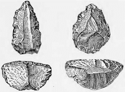 Вместе с этими ручными рубилами не было найдено человеческих останков, поэтому мы не знаем, какой вид первобытного человека первым изготовил их. Подобно скребкам, они могут быть продуктом нескольких различных видов доисторического человека, поскольку они встречаются в Африке и Индии, а также во Франции и Англии. Наука также пока оставляет нас без ответа на другой вопрос. Рубила появились в Западной Европе раньше, чем пришла мода на изготовление скребков. Но старше ли они скребковой школы Китая и Восточной Европы? Здесь пока еще не найдено керновых орудий, залегающих ниже отщепочных (рис. 4). Поэтому вполне возможно, что люди в разных частях мира независимо друг от друга разработали две разные техники более или менее в одно и то же время. Западноевропейцы, возможно, изобрели метод отщепа позже или переняли его у восточных соседей. Это могло бы объяснить, почему на Западе рубила встречаются в более глубоких слоях, чем скребки. Но это ничего не говорит относительно времени их распространения в мире в целом.