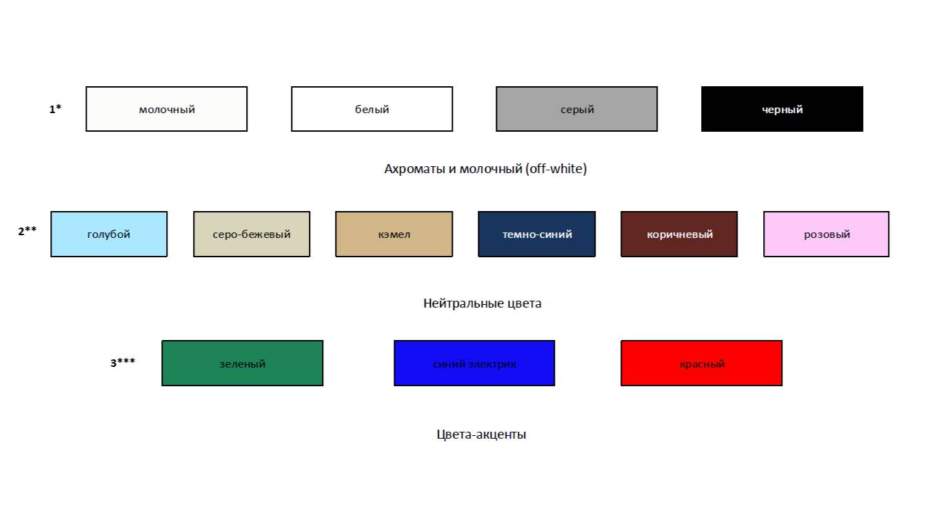 Небольшое количество цвета в гардеробе является залогом высокой вариативности и сочетаемости вещей. В таблице ниже я привела цвета, на которые стоит ориентироваться в выборе базовых вещей. Безошибочный выбор – это ахроматические цвета, которые сочетаются между собой и с которыми сочетаются все иные цвета из таблицы. В частности, сочетание черного и белого в образах – одно из самых простых, но и одно из самых эффектных. Также в эту группу я добавила молочный, который сегодня допустимо сочетать даже с белым. На мой взгляд, молочный (off-white) работает в гардеробе гораздо лучше, чем белый. Он освежает любой тон кожи, не желтит белки глаз и зубы.