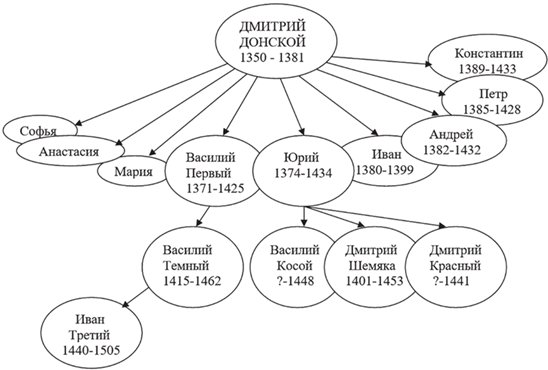 Однако именно здесь в XV веке была развязана кровавая междоусобица внутри семейства потомков Дмитрия Донского. Дмитрий Иванович Донской (1350–1389), великий князь Владимирский и Московский, внук Ивана Калиты (1304–1340) и праправнук Александра Невского (1220–1263), имел 11 детей. На год его кончины в живых было 5 сыновей и 3 дочери. Уже после его смерти родился ещё один сын – Константин.
