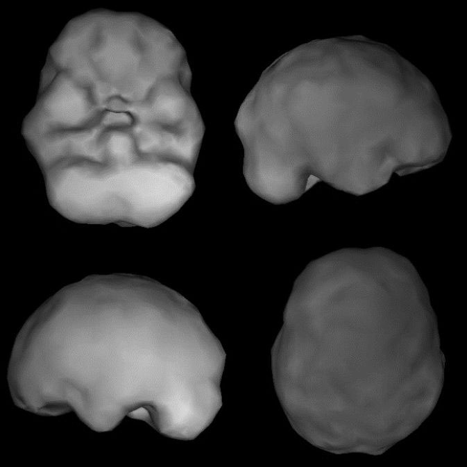 Сверху слева: вид мозга снизу. Сверху справа: вид мозга с правой стороны. Снизу слева: вид мозга с левой стороны. Снизу справа: вид мозга сверху. Здоровый = гладкая, ровная, симметричная активность