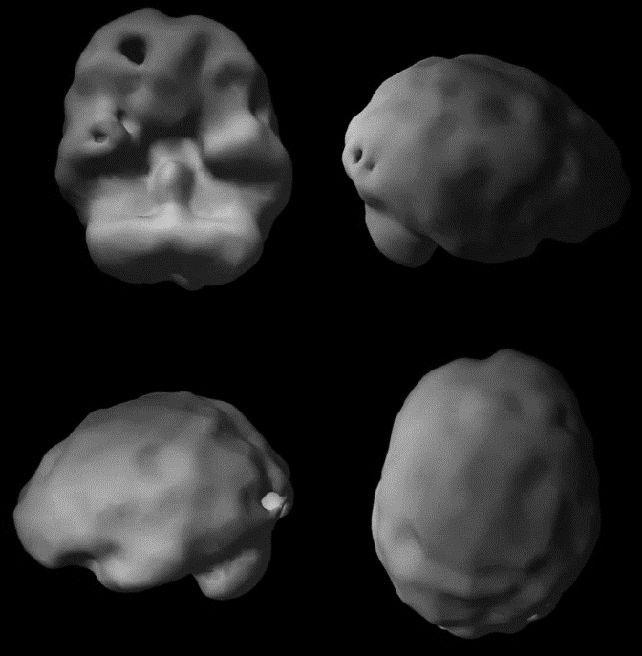 Сверху слева: отверстия показывают низкий кровоток в префронтальной коре и правой височной доле. Сверху справа и снизу слева: уменьшение левой и правой затылочных долей