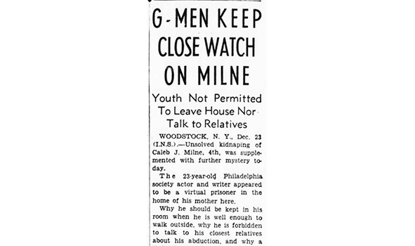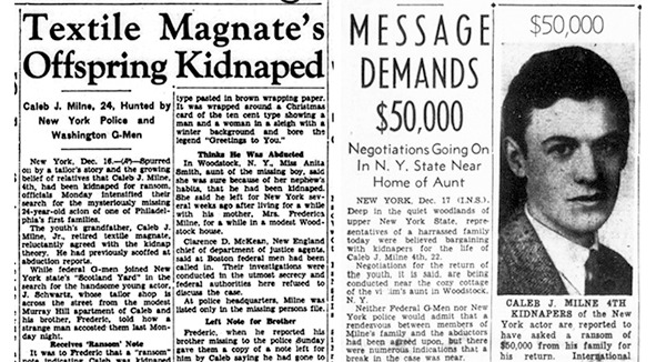 Американские газеты уделяли большое внимание продвижению расследования похищения Калеба Милна Четвёртого. Слева: одна из многочисленных статей, опубликованная 16 декабря в газете «The Bismarck tribune». Справа: развёрнутая публикация о подготовке выплаты выкупа в размере 50 тыс. $ в номере газеты «The Washington times» от 17 декабря 1935 года.
