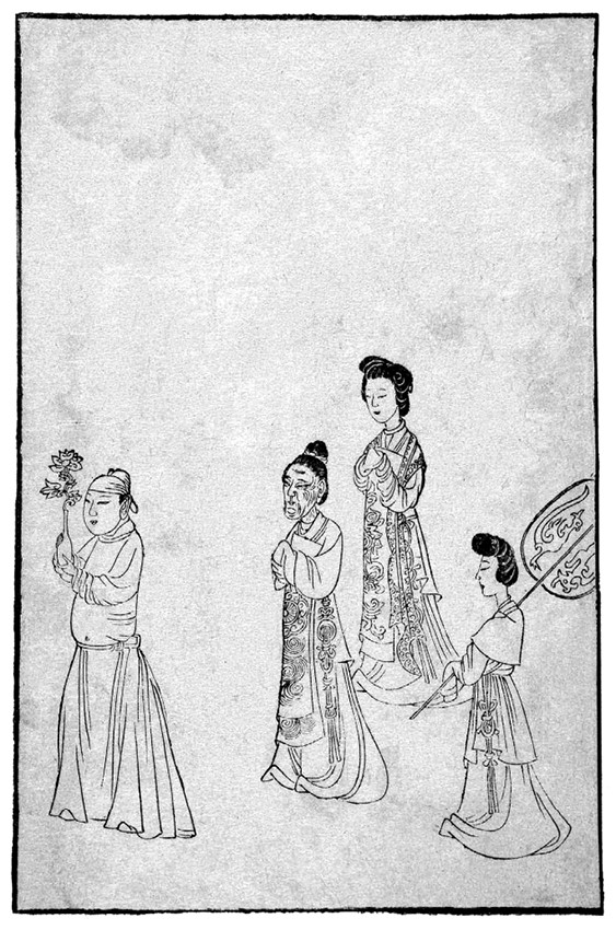 Старая госпожа (входит, говорит). Позавчера настоятель взял деньги на поминание покойного супруга, но еще ничего мне не сообщил. Пошлю-ка я Хун-нян, пусть спросит у него, когда все будет готово для поминального обряда, велит все приготовить получше, а потом принесет мне ответ. (Уходит.)