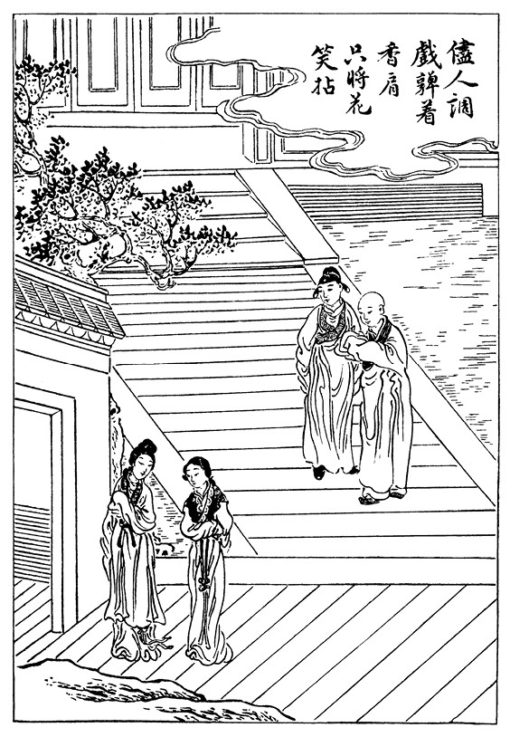 Прежде на залу со статуей Будды я обращаю свой взор. Дальше по этим ступеням схожу я вниз, на монашеский двор. Кухню на западе вижу, В северной части молельня, Звонница высится над головой. Кельи монахов пройдя, Пагоду я огибаю, По галерее иду круговой. Мною архат ни один не пропущен, Всем бодхисатвам молюсь на коленях, всем поклоняюсь святым.Ин-ин (входит вместе с Хун-нян; в руках у нее цветок; говорит). Хун-нян, пойдем поиграем в зале Будды.
