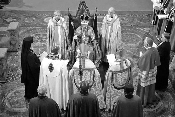 Рис. 7. Карл III восседает на старинном Троне Эдуарда I, сделанном в честь Эдуарда Исповедника. 2023 год. Лондон, Вестминстерское аббатство. Взято из Интернета